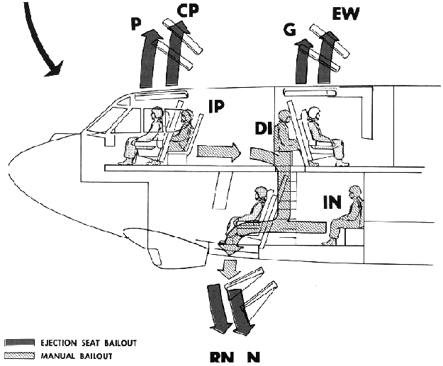 Illustration of the positions of the six B-52 crewmembers, including temporary positions for the Instructor Pilot (IP); Defense Instructor (DI); and Instructor Navigator (IN).