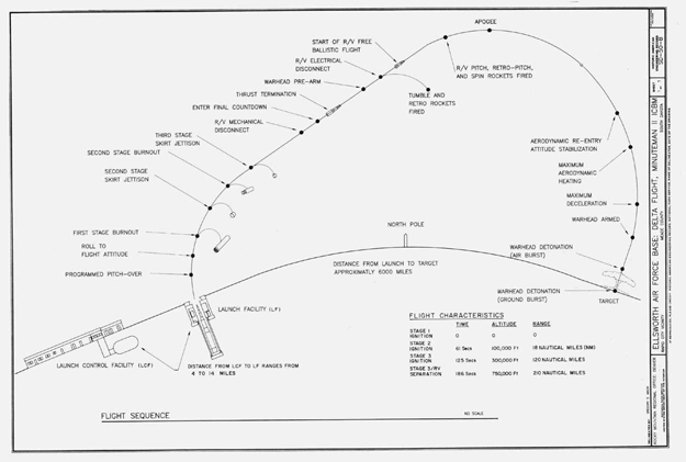 Flight sequence of a Minuteman II. Unlike the large Atlas and Titan liquid-fuel ICBMs that rose slowly into the air, the Minuteman streaked out of the silo. Three seconds after launch the missile began a gentle turn toward the target. The first stage separated after 60 seconds at an altitude of nearly 19 miles. The second stage separated at about 120 seconds, and the third stage separated from the reentry vehicle at about 180 seconds, at which time the missile had reached an altitude of 142 miles and was traveling at a velocity of 23,000 feet per second (15680 MPH). At the apogee of its parabolic flight path the reentry vehicle reached an altitude of over 700 miles above the earth’s surface.