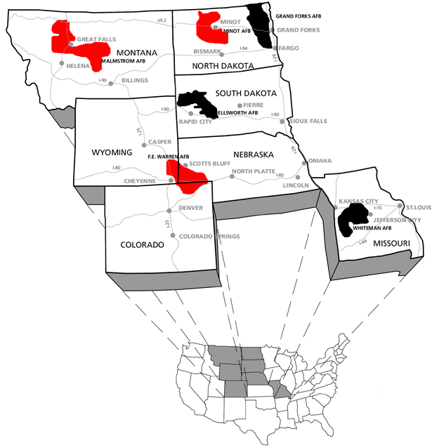 Locations of the six Minuteman ICBM complexes. The red sites, including Malmstrom AFB, Minot AFB, and F.E. Warren AFB remain active with 450 Minuteman III; while the black sites including Whiteman AFB, Ellsworth AFB, and Grand Forks AFB were decommissioned in the 1990s as a result of the Strategic Arms Reduction Treaty in 1991.