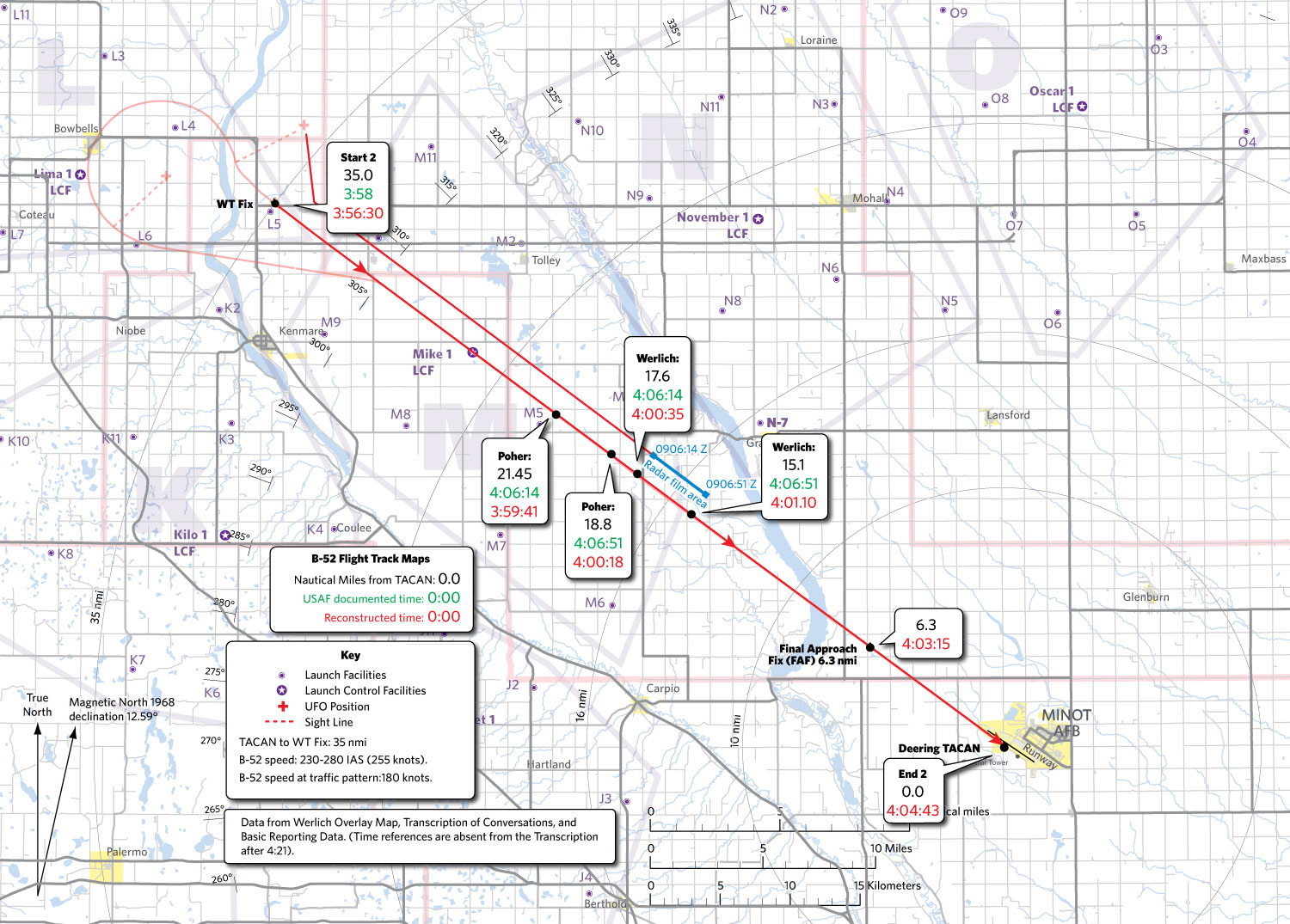 As the B-52 clears the WT fix at FL200 to begin the gradual descent to Minot AFB, the UFO instantly closes distance from 3 miles to one mile off the left wing of the B-52. At the same time, the B-52's radios cease transmitting. The UFO continues pacing the B-52 for about 4 more minutes before disappearing from the B-52 radarscope. Radarscope film is taken and 14 photographic prints show the UFO spiral around the B-52 near the end of the trajectory. Poher's photogrammetric analysis of photo #783 indicates the B-52 is 18.8 nmi from the TACAN. (See: Poher, Part 3.4-3.6). According to the communications transcript, after 4:02 the B-52's radios resume normal functioning. RAPCON wondered whether the UFO caused the radio troubles, to which the copilot responded, "I don't know… but that's exactly when they started" (Transcription, 0904).