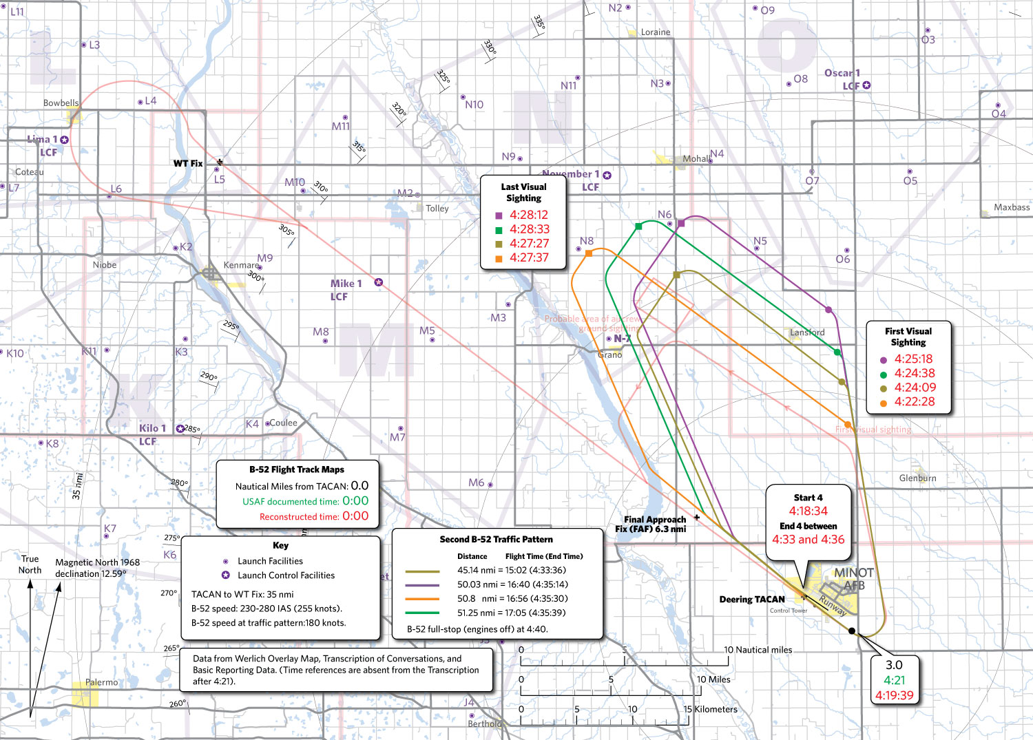 Following 4:21, the timecode references are absent in the communications transcript for the final traffic pattern. In addition, RAPCON’s vector directing the B-52 onto the 290-degree downwind leg is absent, which evidently includes the pilot-RAPCON conversations over several minutes. During this time, the B-52 pilots visually observed the UFO on or near the ground ahead of the aircraft, before coming alongside and turning over the UFO onto the base leg. Based on our reconstruction, we have extrapolated four patterns the B-52 could have flown, which would have resulted in a terminal landing (parked with engines off) at 4:40. (See: Transcription, 0921+). This circuit required a total flight time of between 15:02 and 17:05 minutes, or 1-3 minutes more than the previous circuit, allowing for an extension of the pattern to the North and/or West.