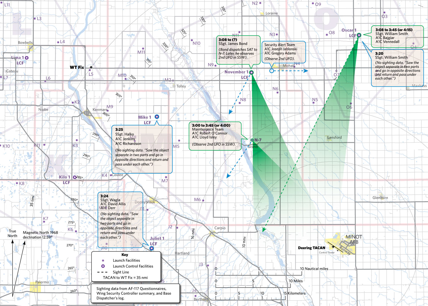 The 91st SMW security controller noted: "[3:20] SSgt. Smith at Oscar-1 saw the object separate in two parts and go in opposite directions and return and pass under each other. At this time [3:24] [Juliet] Flt and [3:25] Mike Flt Team observed the same things and described it the same way" (Wing Security Controller summary). The security personnel at Mike and Juliet-Flights were not interviewed during the investigation, and details of their observations are unknown. Bond, Jablonski, Adams, O'Connor, and Isley also reported observing two similar objects. Bond reported the second object was in view for about three minutes (AF-117, 4). Following their initial observation at 3:08, Bond dispatched Jablonski and Adams to N-7. Jablonski reported, "When first dispatched to N-7 another object exactly the same appeared out of the east and picked up speed moving towards the other. Never did see the two join as the second one disappeared" (AF-117, 4). O'Connor and Isley noted, "at one time there were two in the area" (AF-117, 4). At 3:28 the Base Operations dispatcher noted, "two are seen now" (0828). According to the Transcript of Communications between RAPCON and the B-52 pilots: “0830 (3:30) Controllers received information on UFO 24 miles NW.” This location was near Mike-1 LCF northwest of N-7. At the same time observers at N-7 were reporting the UFO in the southeast.