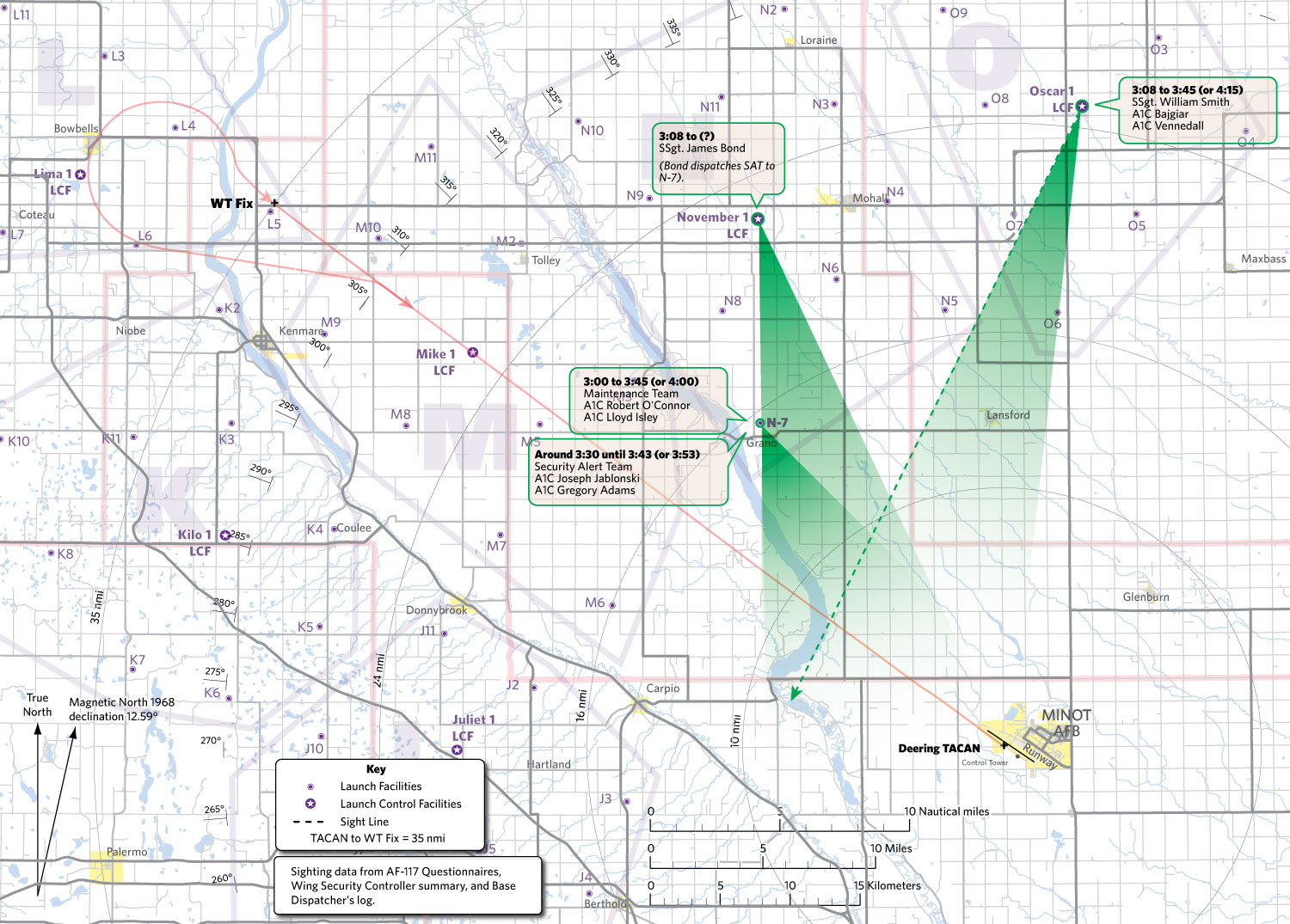 The November SAT team of Jablonski and Adams would have joined O'Connor and Isley at N-7 around 3:30. Jablonski continued to report the UFO's "various maneuvers which occurred basically in one general area … S.S.E. of the Launch Facility" to the Base Operations dispatcher over the radio (AF-117, 9). The dispatcher notified them that a B-52 was being "diverted to [the] general area," and provided the exact time and location of its arrival (AF-117, 3, 7). According to the Transcription, and our reconstruction of the B-52 flight track, the B-52 would have appeared after 4:02, high and to the west-southwest of N-7. At the same time, the UFO they had been observing southeast of N-7 had descended to the horizon and "was no longer seen in that location" (Jablonski, AF-117, 5, 9). The time of the final observation of the UFO in the southeast varies in the documentation between 3:43-4:15. For example: 3:43 (Jablonski); 3:45 (O'Connor and Smith); 3:51(Adams); 4:00 (O'Connor); and 4:15 (Smith).
