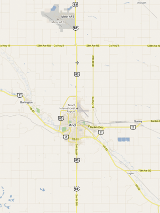 In Figure 1, the trajectory and traffic patterns around the airport do not have this orientation because 290 degrees is almost directly west, whereas the map indicates a trajectory to the northwest. For comparative purposes I located a map of the Minot international civilian airport. We see that the main runway 13/31 is oriented at true headings of 130 and 310 degrees, which conform to the trajectories in Figure 1. The second short civilian runway 08/26 is oriented at 080 /260 degrees true. Therefore, the prevailing winds in the region are oriented 130/310 degrees. An online search located the following regional map showing the position of Minot AFB in relation to the city of Minot, ND.