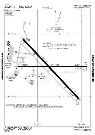 Figures 2 and 3. Location of Minot International airport and Minot Air Force Base 13 miles north on Hwy. 83; and diagram of the international airport at Minot, ND. Source: Wikimapia, and Minot International (MOT).