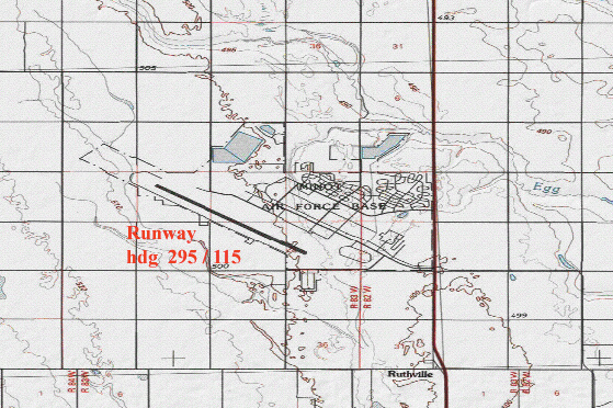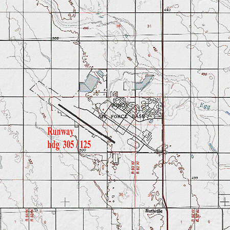 Based on the scale of the map, Minot AFB is located 13 miles (21 km) north of the city of Minot, ND. Even though it is unlikely that prevailing winds are different between the two airports, I nevertheless checked wind conditions. Another online search was more difficult, likely because Minot AFB is still a strategic airbase with nuclear missiles on alert. On a web site devoted to civilian pilots I located a simplified air view of the base, in which the runway is clear and the confidential installations are not indicated.