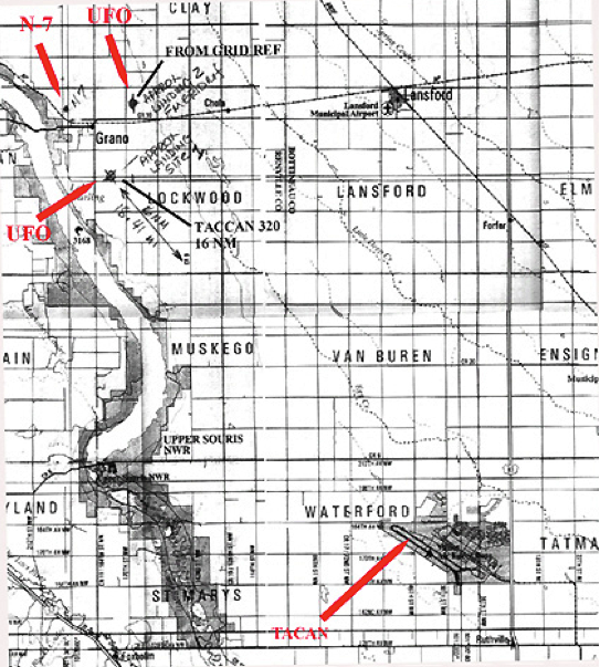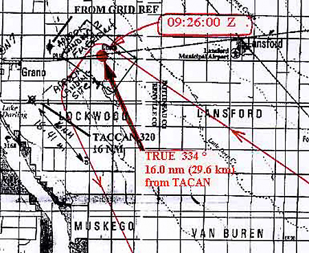 The cross rulings on this map are in statute miles and equal 1609 meters. The coordinates of the landing area situated to the northeast of Grano, ND, are relative to the Deering TACAN transmitter adjacent to the runway at 37% of the length from the northwest end. Werlich indicated the landing area as being 16 nautical miles (29.6 km) from the TACAN transmitter at 320 degrees radial. How this position was obtained is not stated in the Blue Book documents, however, it is possible that there is an error in the 320 degrees azimuth as a result of confusion between the magnetic and true azimuth.[2] The difference would be 334 - 320 = 14 degrees, which is close to the 13 degree magnetic declination for Minot at the time. The northwest landing area (AA-43) is indicated from its coordinates on the grid map. This location is provided in the documentation in the summary that was apparently prepared and submitted by the 91st Strategic Missile Wing, Security Controller. The original source of this information is not specified.[3]