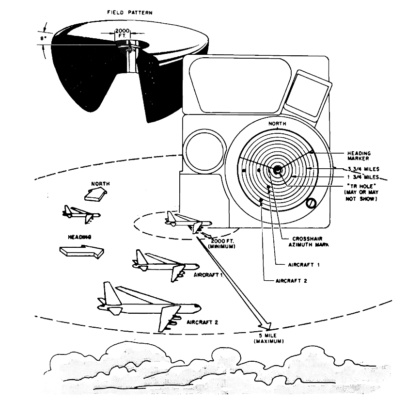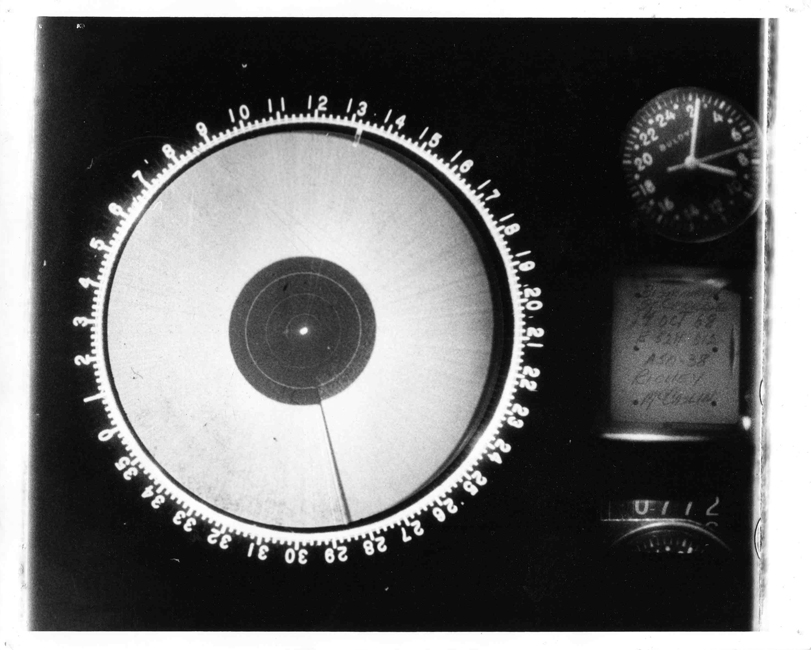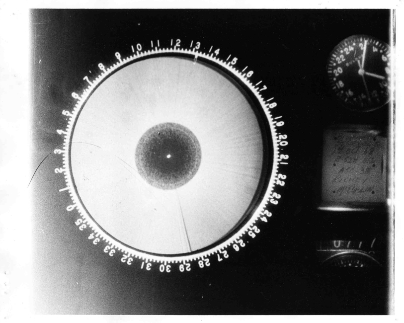 This would be consistent both with Richard Clark's recollection that the camera was switched on belatedly (as concluded here) and left running until they landed, producing a great many frames, and with the fact that he said "I had them print every significant image", recalling "nothing of any value" on the later frames (see also Note 4). On the succeeding frames the altitude hole radius would dwindle rapidly, even with the antenna tilt at maximum elevation in Station Keep, and would vanish entirely long before the aircraft descended to a couple of hundred feet to execute its low approach over the Minot runway. After this the B-52 never recovered sufficient height for the altitude hole to reappear. They overflew the "landing" location at a reported 1500 ft, which is comparable to the minimum range of the display (the ~2000ft TR-hole radius caused by de-ionisation delay in the antenna duplexer). So these frames would not be able to show any targets in the air, only a scope completely saturated with ground return. It's very probable that the echo from any object on or near the ground would have been lost against the ground echo itself. But even if this ground-scan did contain latent information of use to someone who knew what they were looking for, Richard Clark did not not know about any UFO on the ground and was not himself asked to look for evidence of it.