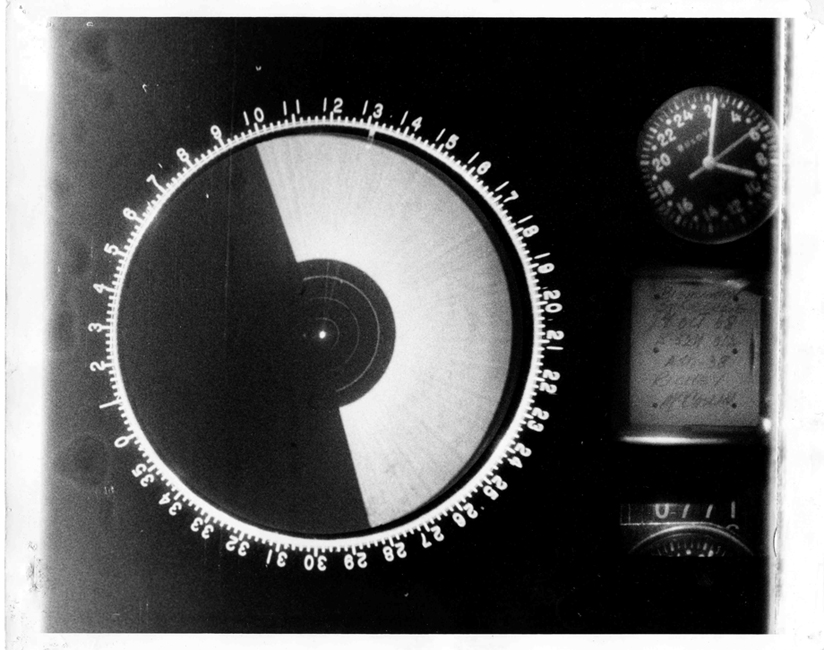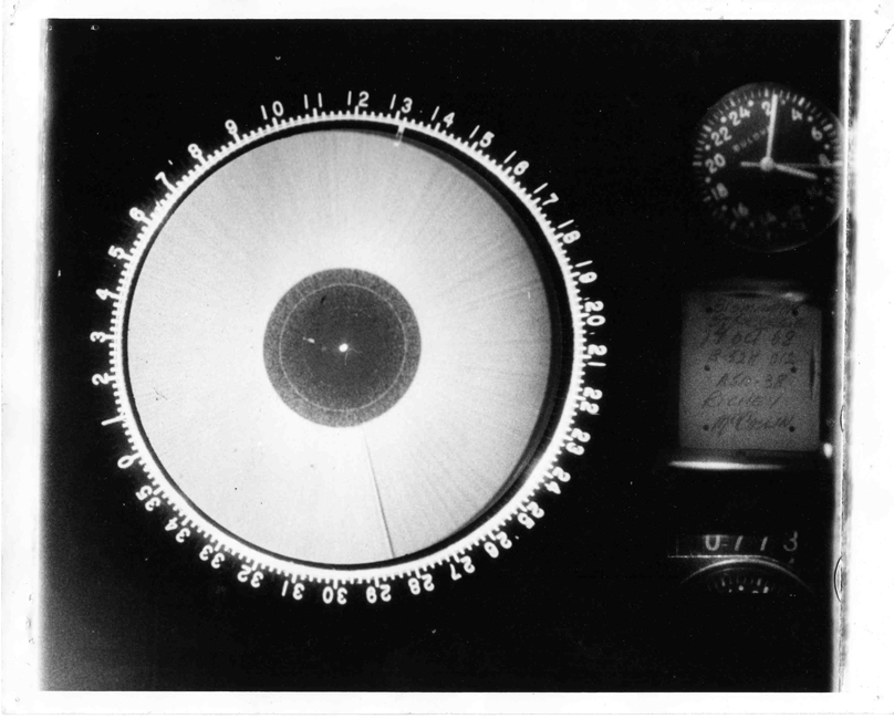 Further evidence of this emerges when we try to explain why the first of the numbered frames, #771, appears to capture a half-revolution of the radar sweep, hitherto assumed to mark a change in the scan mode at the start of the event when the radar was first put into Station Keep (see Section 2 above). Training Manual CDC 3210K Vol.4 discloses that the operation of the camera, rather than being a snapshot of the PPI display capturing an image with a persistence comparable to the 3 second rotation time, is a time exposure, the shutter being open for virtually the whole 3 seconds. (I initially assumed that it was snapshot because the moving clock second hand and the number counter are "stopped" by a brief exposure. But the brevity is explained by the fact that the clock and counter are physically separate from the PPI and photographed through a different lens system. The images are combined by a double exposure.) The PPI exposure is controlled electrically by a loop from the antenna rotation mechanism. At a certain point the rotation closes a circuit and sends a voltage to the camera shutter and film advance mechanism, capping the shutter for 50 milliseconds during which time a motor winds the film to the next frame.