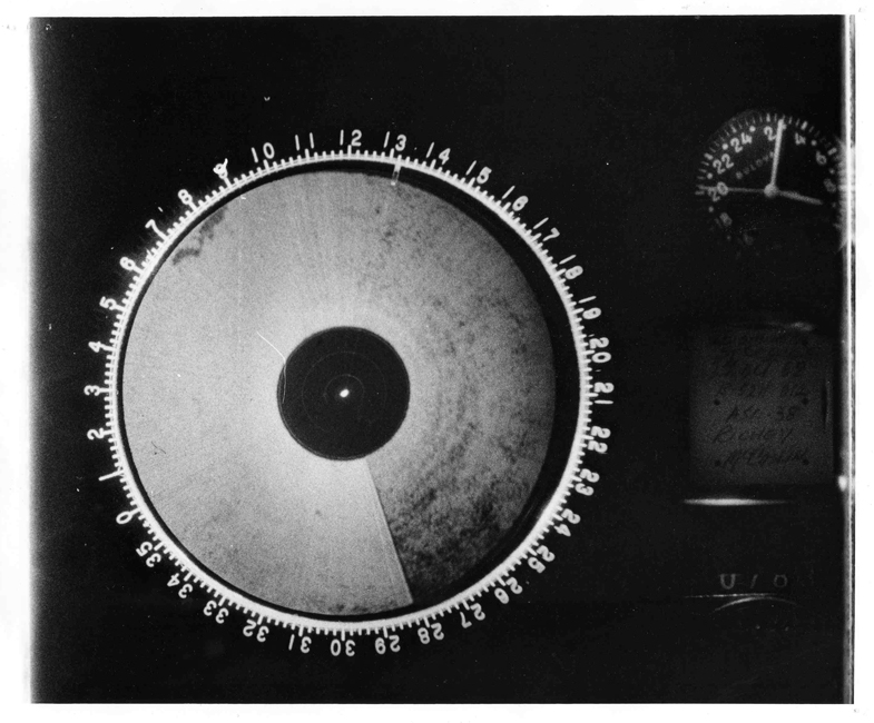 This momentary interruption appears to be marked by the narrow dark wedge visible on the photos between 280 and 290 degrees (strictly, capping the shutter for 50 milliseconds ought to interrupt the image over an arc of 6 degs; the wedge visible is always much less than this angle for uncertain reasons). This is the radial line suggested above as the origin of McCaslin's mistaken "WNW heading marker" on a negative print. Frame 771 therefore shows the shutter opening with the PPI sweep at about 100 degrees followed by a time exposure of approximately 1.5 seconds until a voltage from the antenna rotation mechanism trips the camera shutter, closing it at 284 degrees and causing a fresh frame, # 772, to be advanced into place. In other words #771 shows the instant, nearer the end of the event than the beginning, at which the camera switch was operated, rather than the instant at which the radar's Station Keep switch was operated.